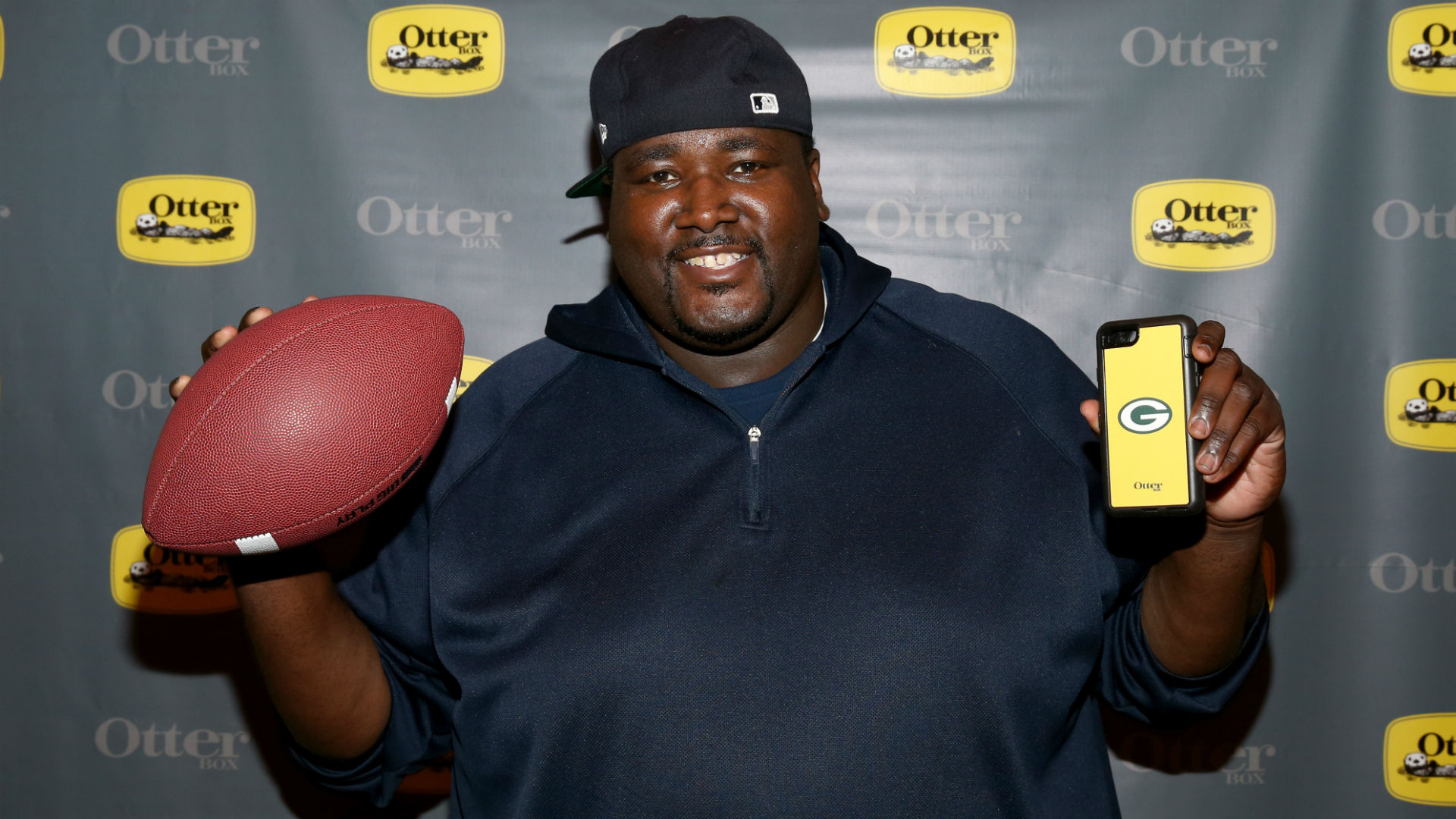 Description: A man holding a football and a cell phone in his hands and a camera in his other hand.