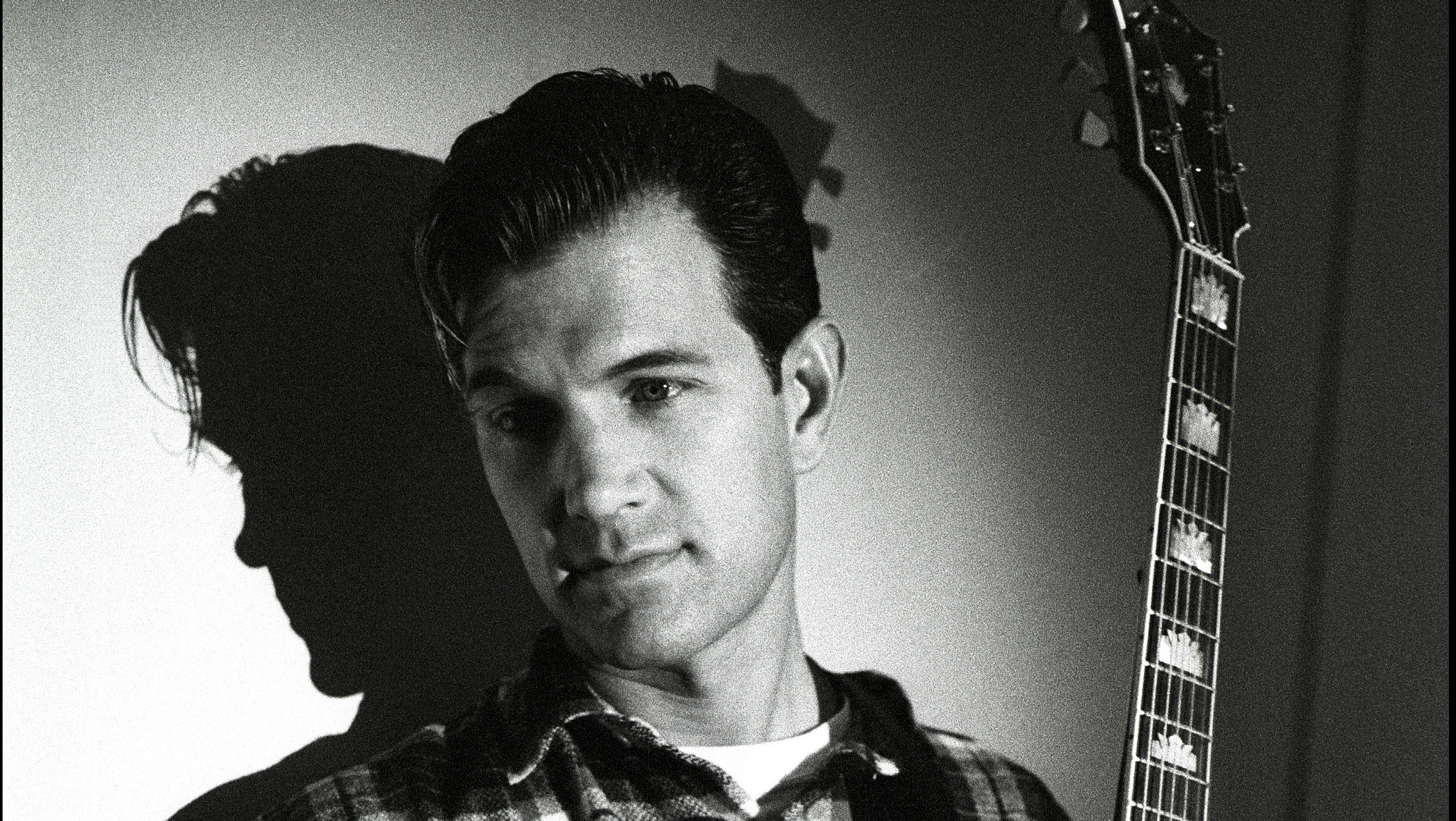 Description: A man holding a guitar in his hands and a shadow of a person behind him on the wall behind him.