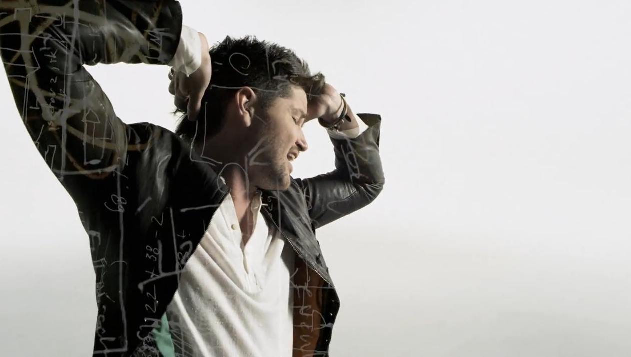 Description: A man holding his head in his hands with a piece of puzzle in the background of him and a piece of a clock in the foreground.