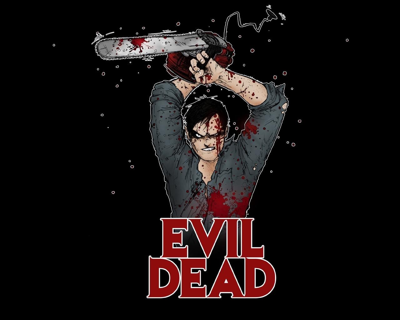 Description: A man holding a knife over his head with blood on it and the words evil dead written on it.