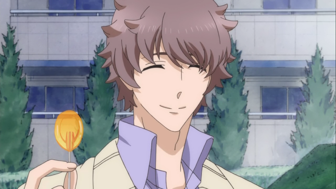 Description: A man holding a lollipop in his hand in front of a building with trees and bushes in the background.