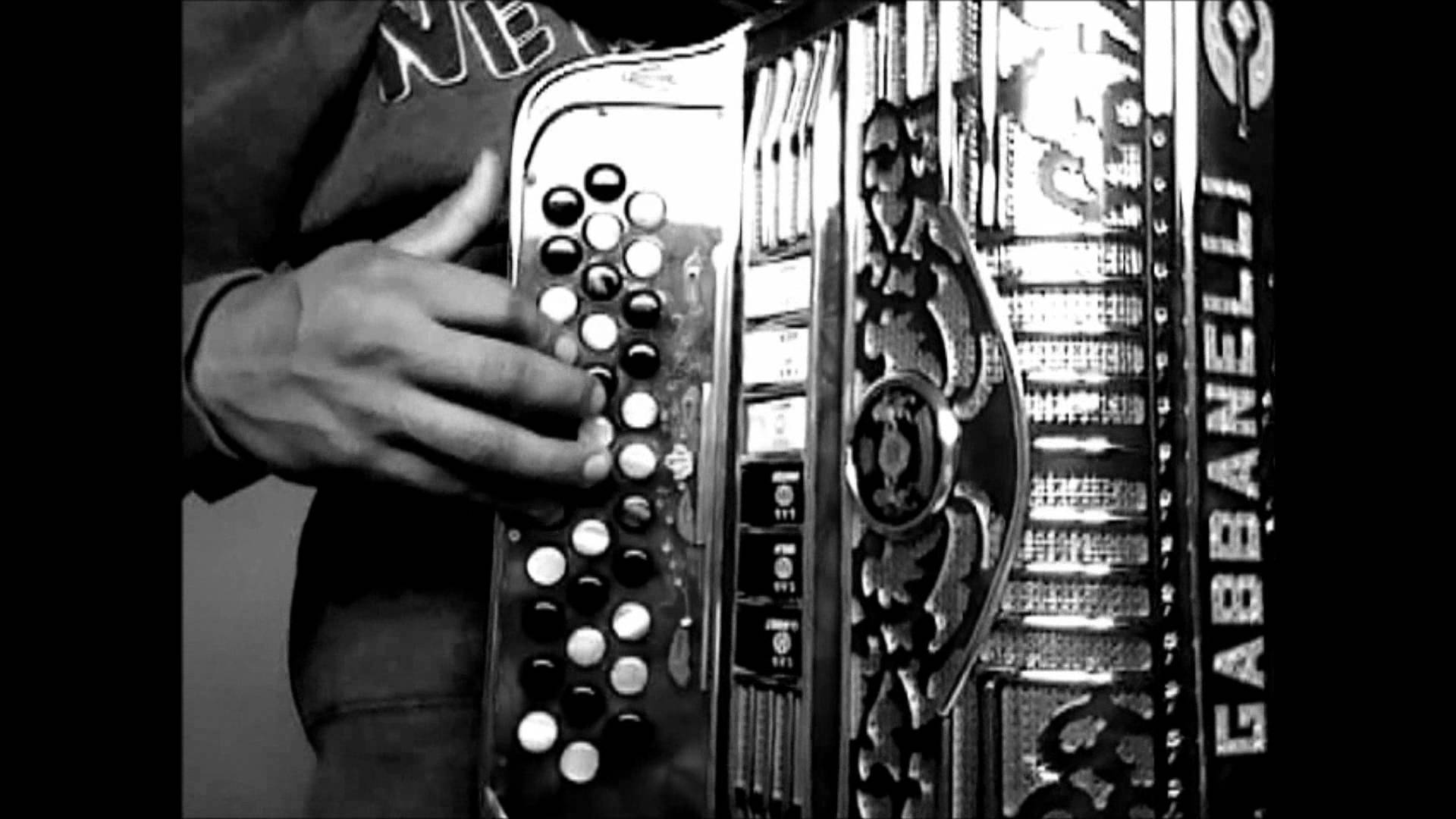 Description: A man holding a metal accordion in his hands and a black and white photo of him holding the accordion.