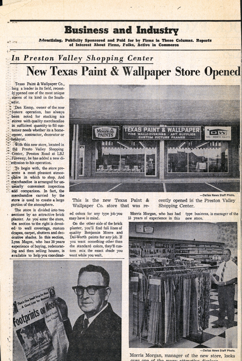 Description: A newspaper article with a man holding a newspaper in front of a store front door and a newspaper clipping about the new texas paint & wallpaper store opened.