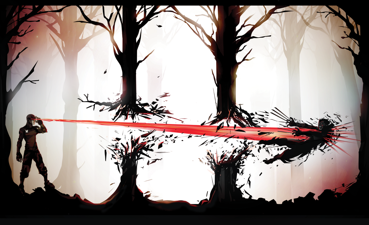 Description: A man holding a red object in a forest with trees and branches in the background.