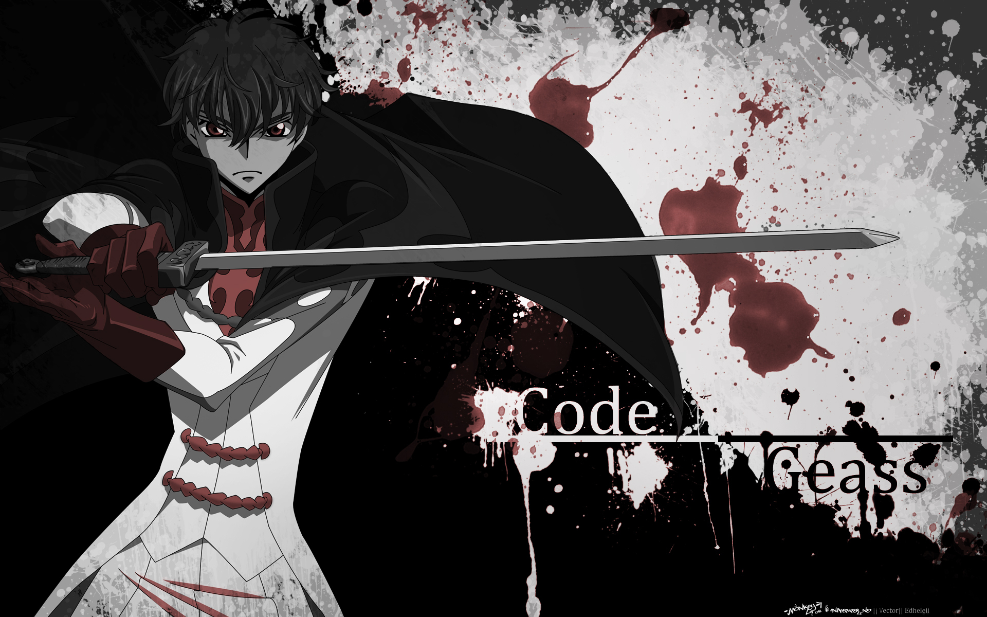 Description: A man holding a sword in front of a blood splattered wall with the words code necasts.