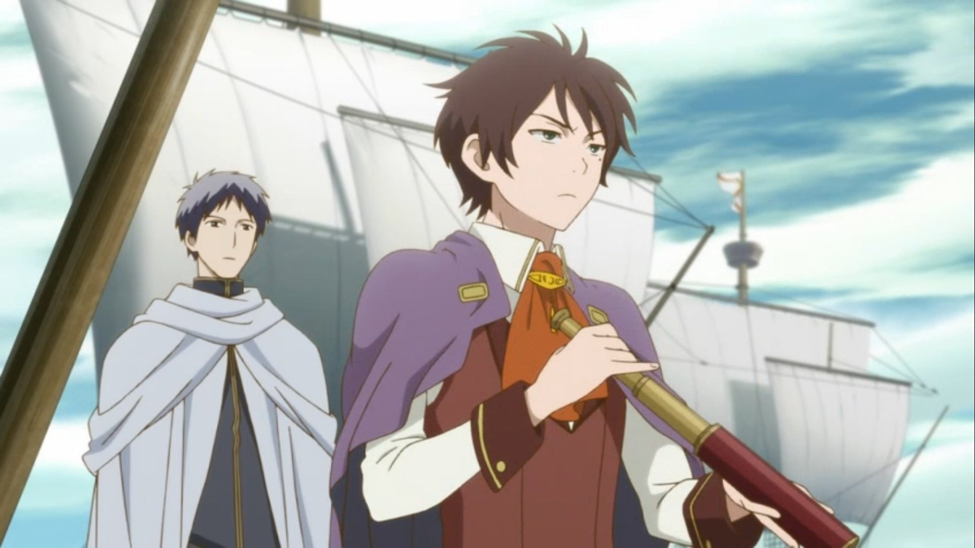Description: A man holding a sword next to another man in a boat in the ocean with a ship in the background.
