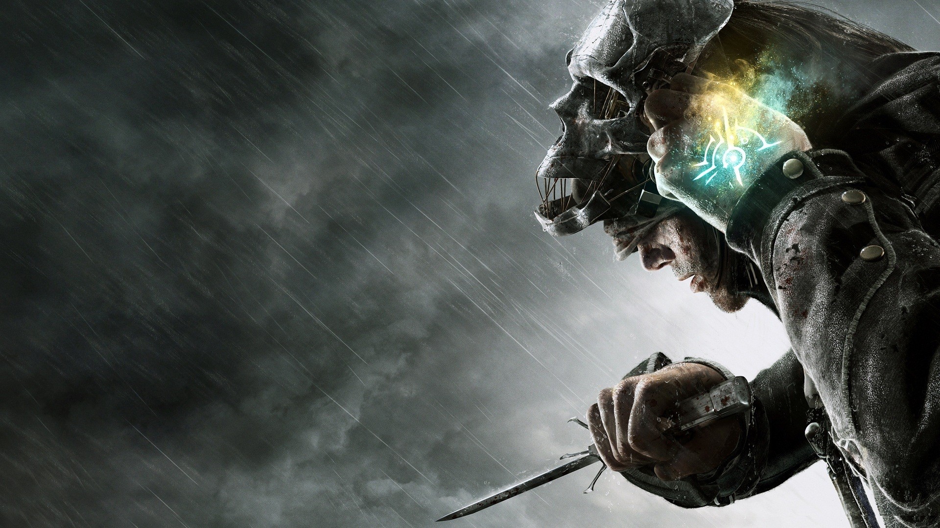 Description: A man holding a sword in a dark sky with clouds in the background and a glowing eye on his face.