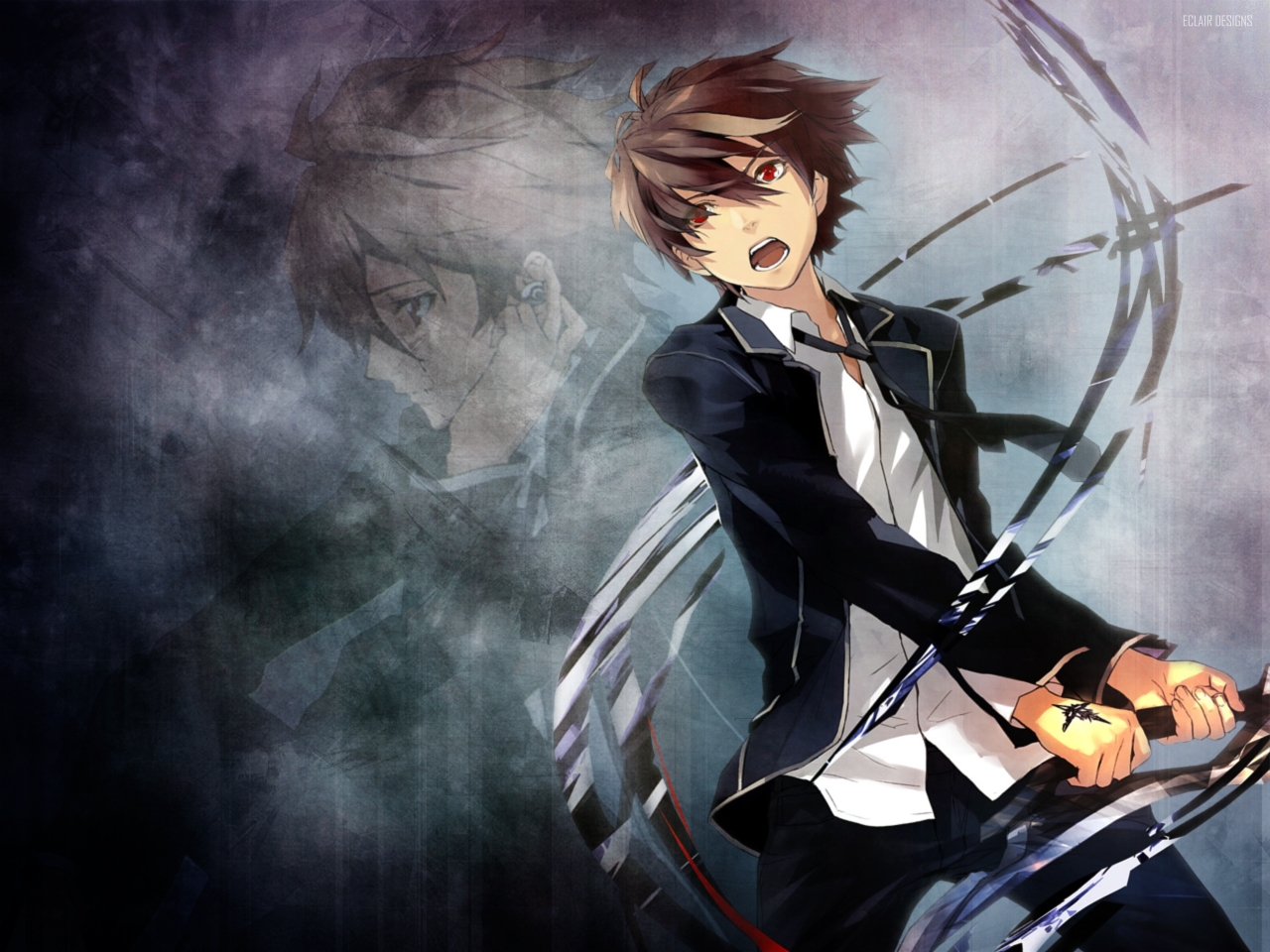 Description: A man holding a sword in front of a wall with a spider man on it's back and another man in the background.