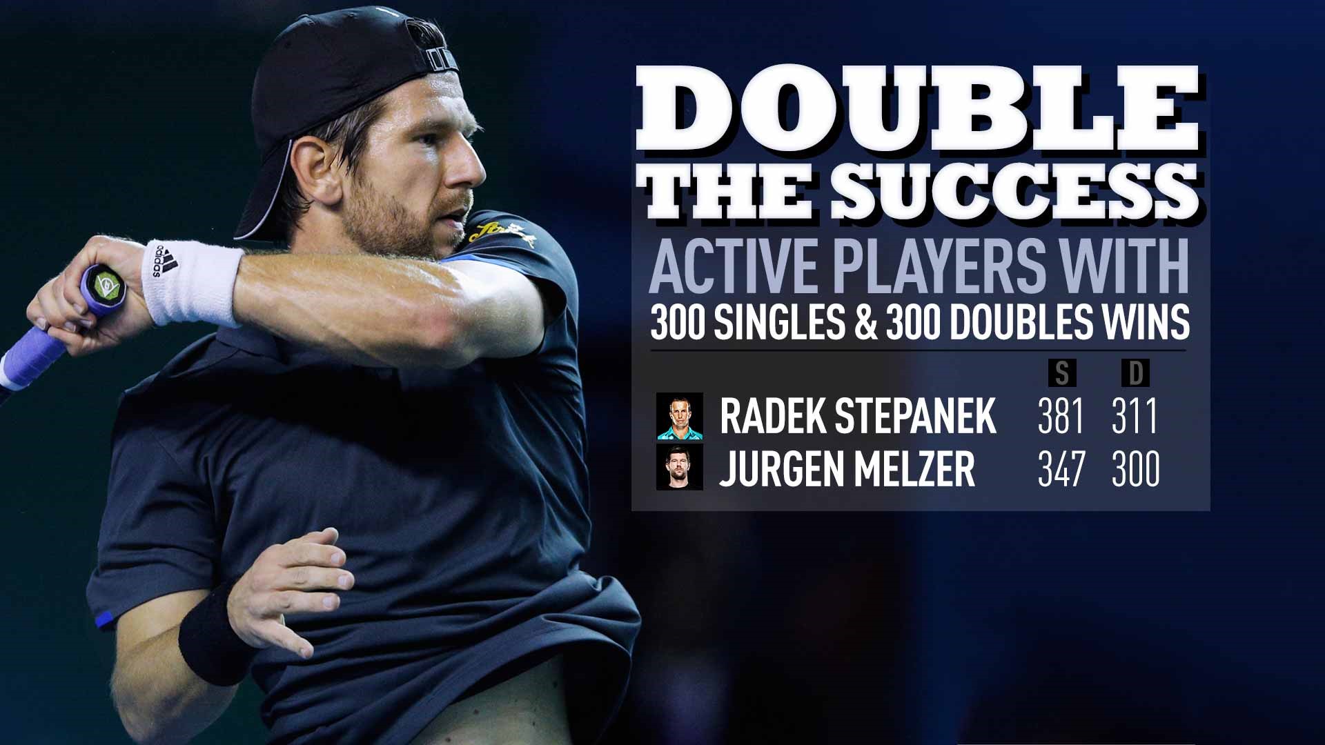 Description: A man holding a tennis racquet on top of a tennis court with a quote above it that reads double the success.