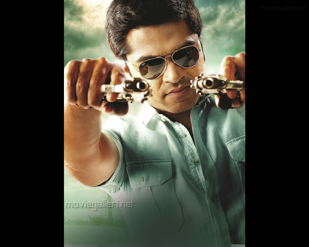 Description: A man holding two guns in his hands and wearing sunglasses on his face.