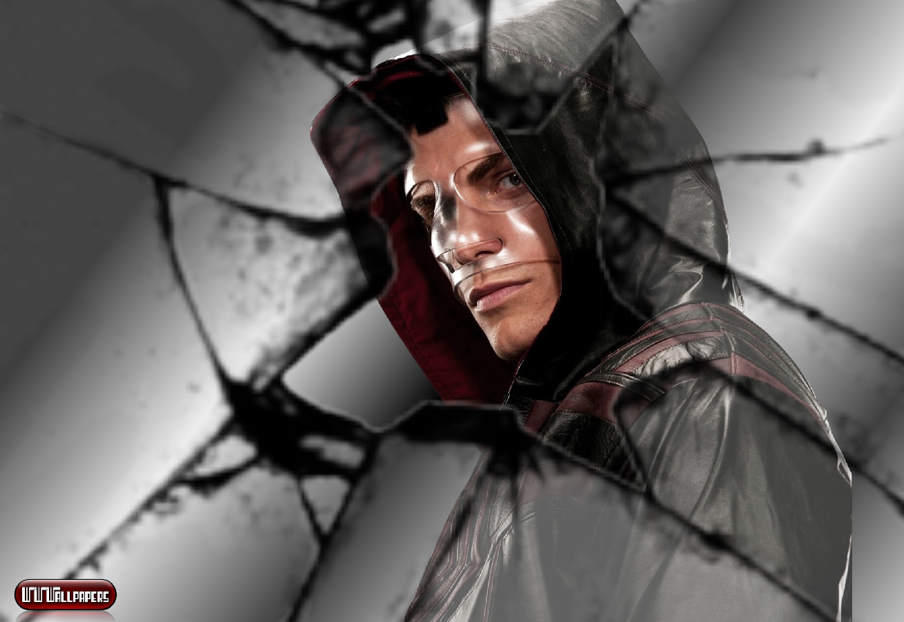 Description: A man in a hooded jacket looking through a broken glass window with a bloody face on it's face.