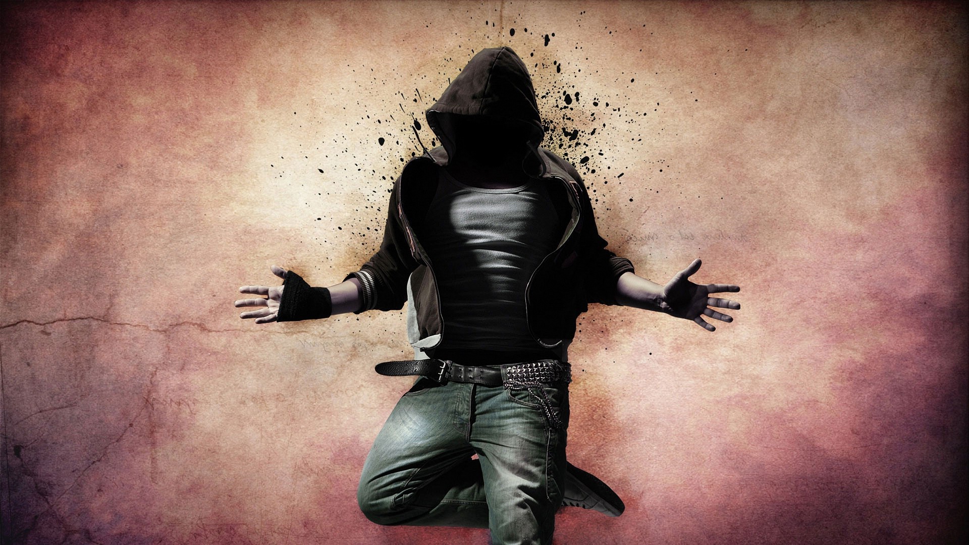 Description: A man in a hooded jacket and green pants is standing in front of a wall with his arms outstretched.