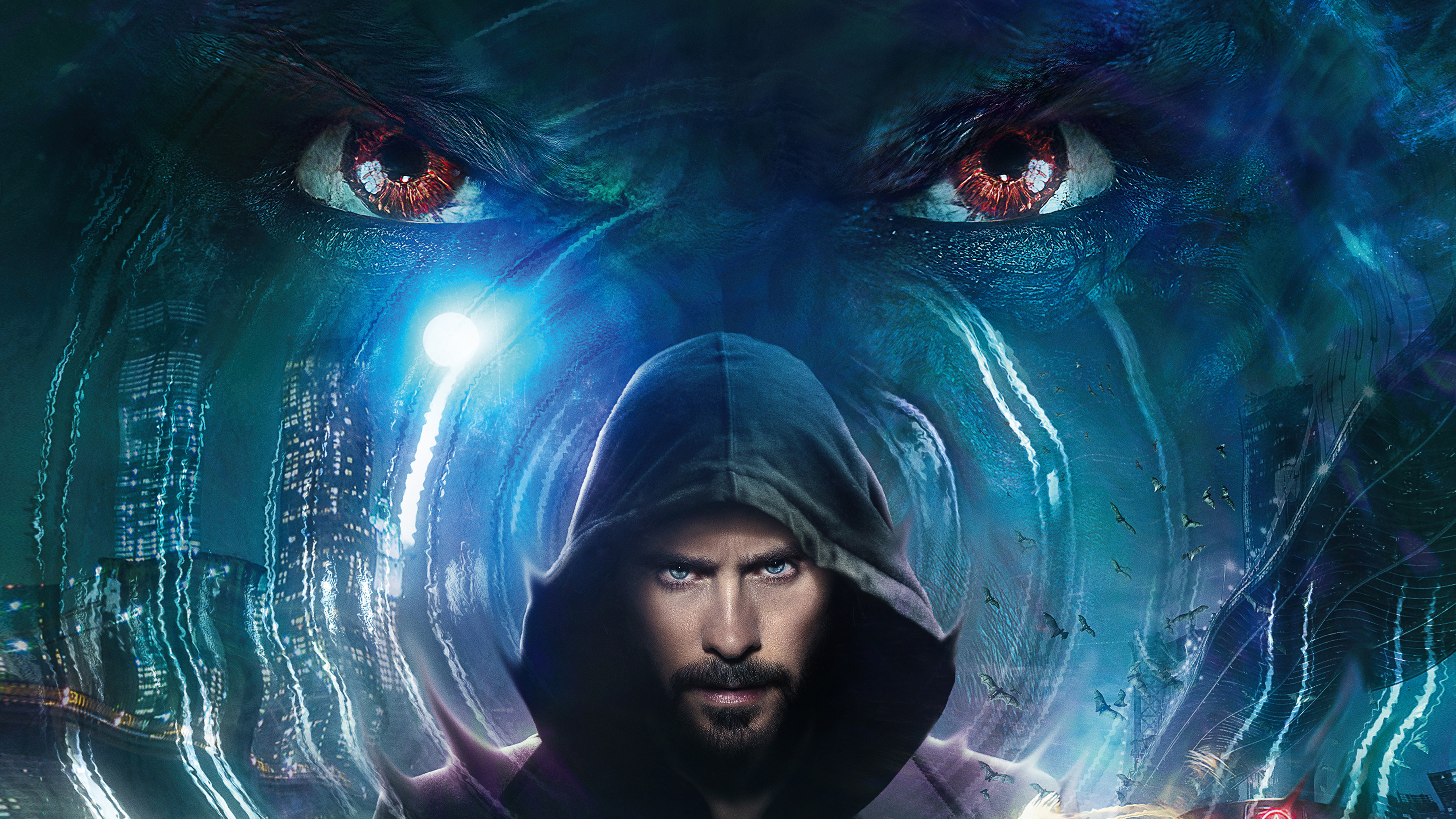 Description: A man in a hooded jacket standing in front of a city with red eyes and a futuristic city in the background.