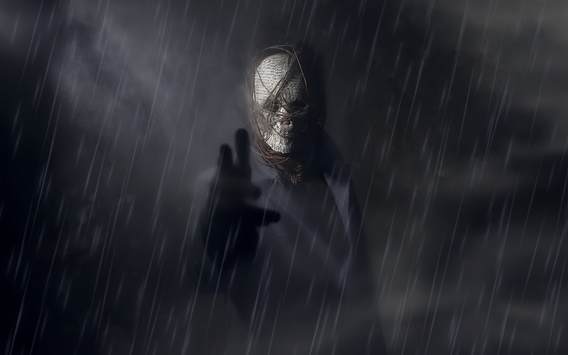 Description: A man in a hooded jacket and a mask in the rain with his hands up in the air.