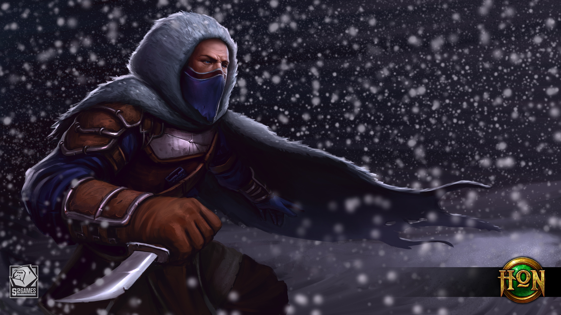 Description: A man in a hooded outfit holding a sword in the snow with a hood on his head and a sword in his hand.