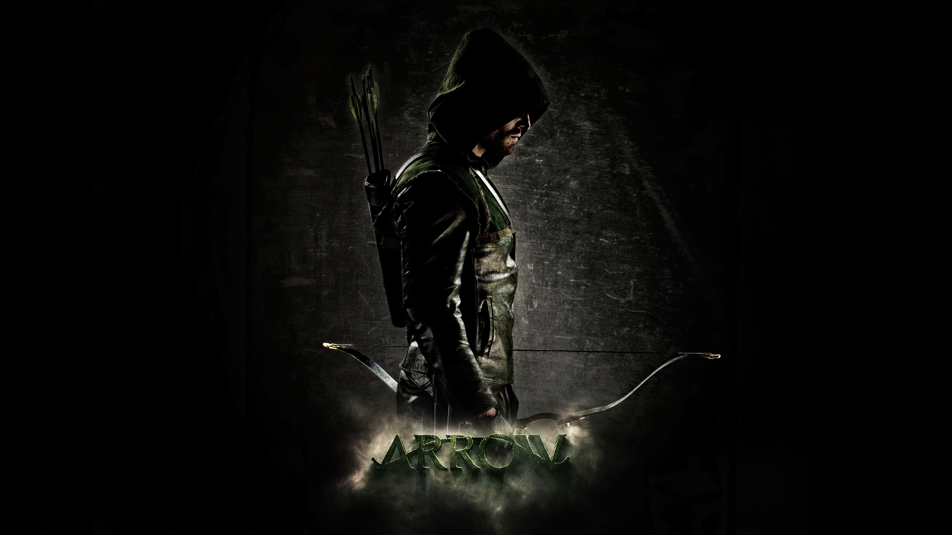 Description: A man in a hoodie holding a bow and arrow in the dark with a glowing arrow in the foreground.