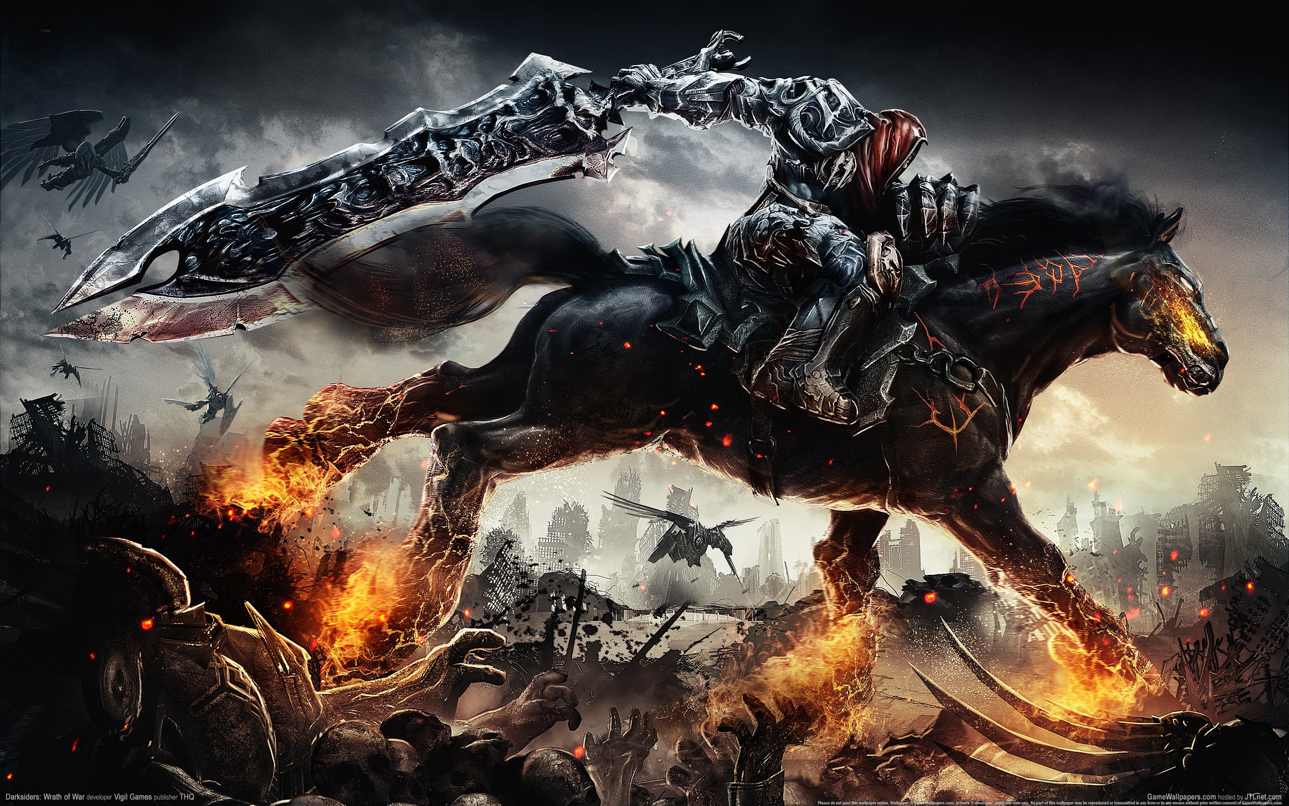 Description: A man riding a horse through a fire filled city with a sword in his hand and a sword in his mouth.