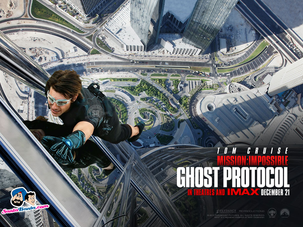 Description: A man in black jacket and sunglasses on a glass walkway with a cityscape in the background and a poster for a film.