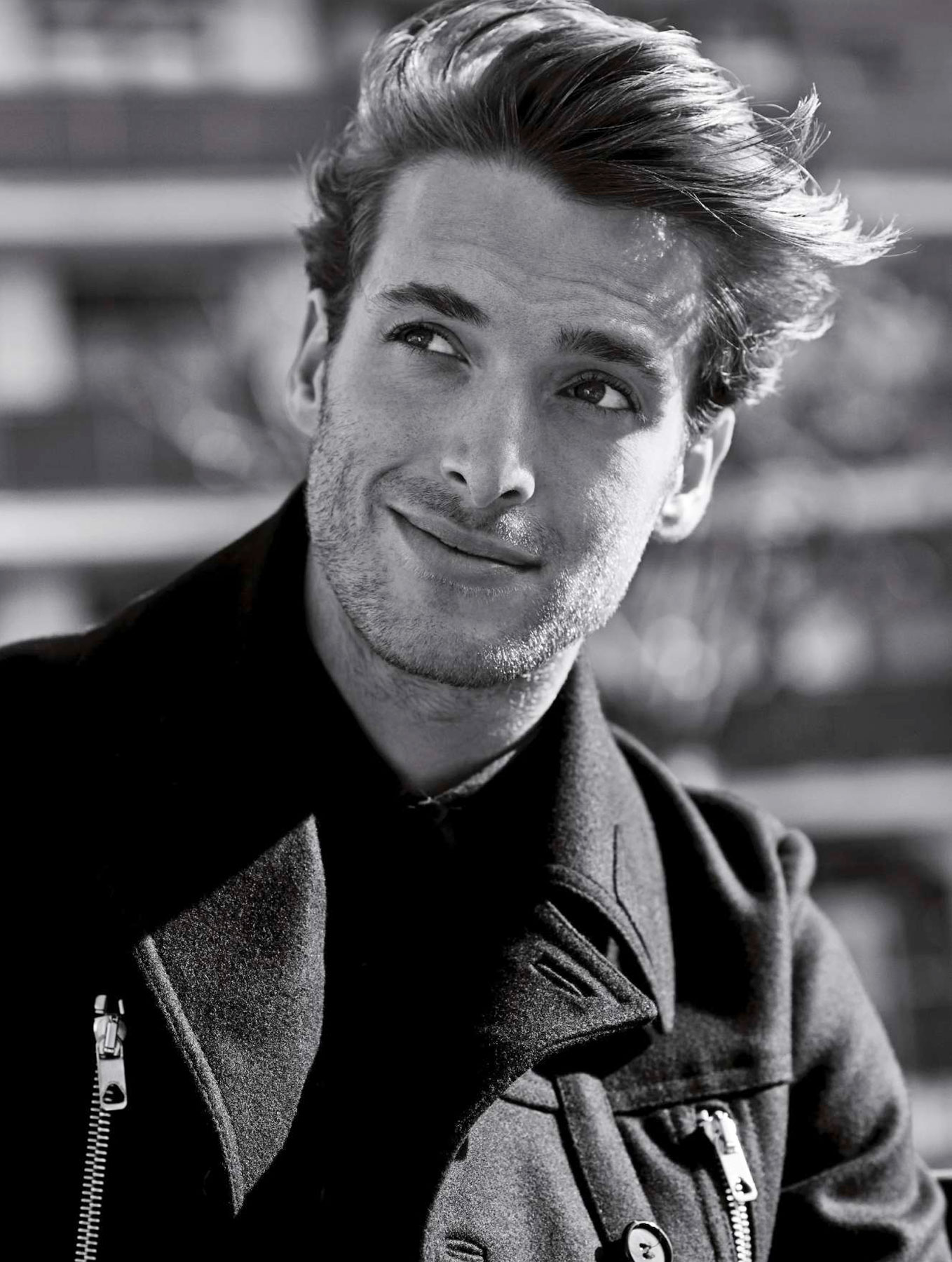 Description: A man with a jacket on smiling at the camera with a building in the background in black and white.
