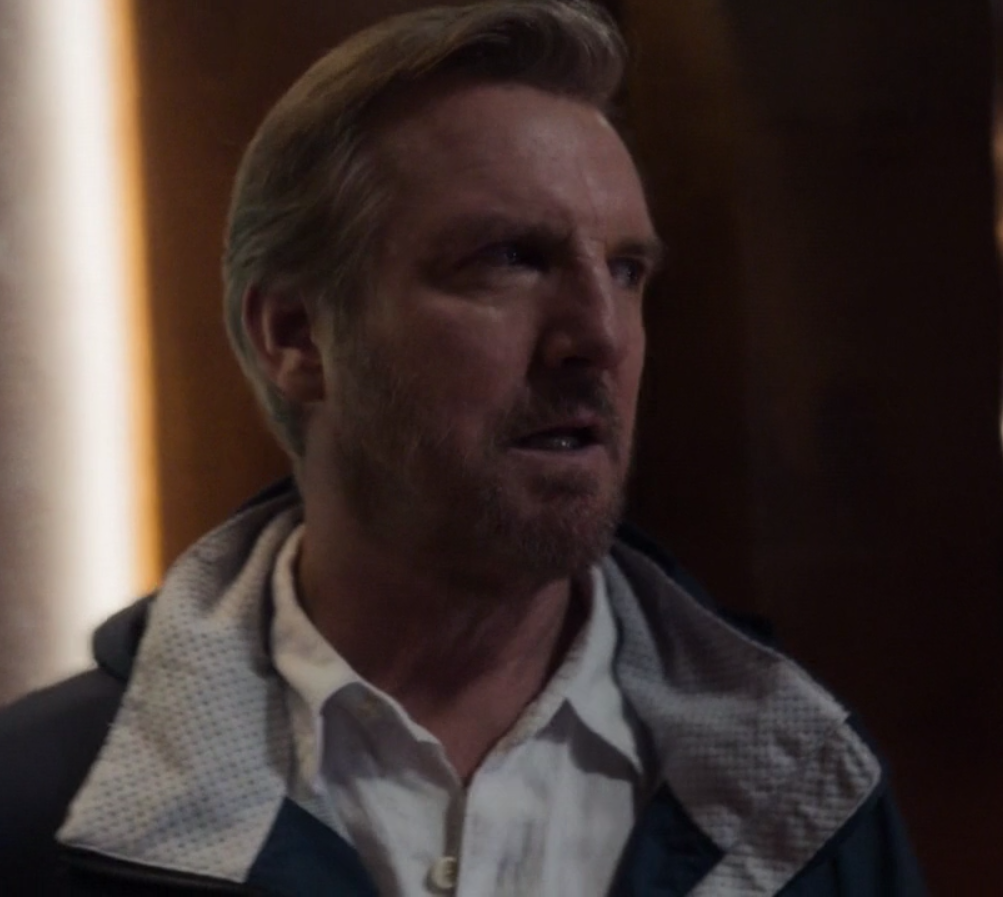 Description: A man with a jacket on standing in a room with a wall behind him and a door in the background.