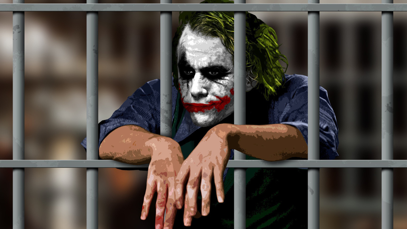 Description: A man in a joker mask behind a jail cell door with his hands on the bars of the cage.