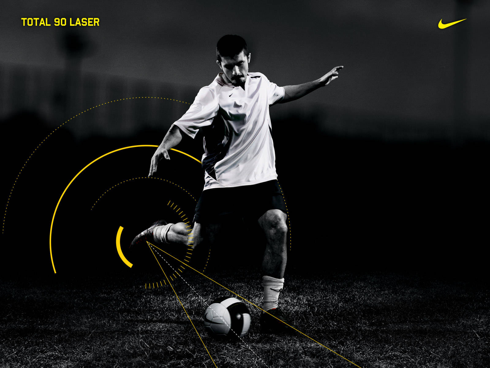 Description: A man kicking a soccer ball on a field with a yellow line around it and a black and white background.
