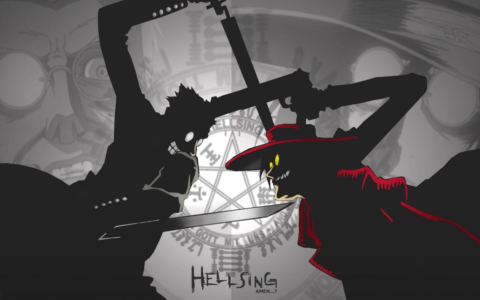 Description: A man with a knife in his hand and a clock in the background with a pen and ink drawing of him.