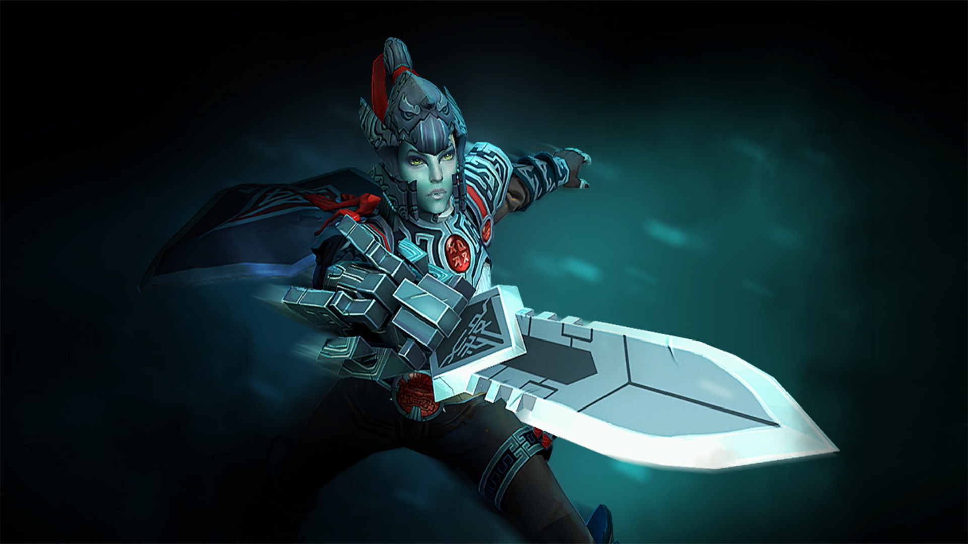 Description: A man holding a large knife in his hand in a dark room with a black background and a green light.