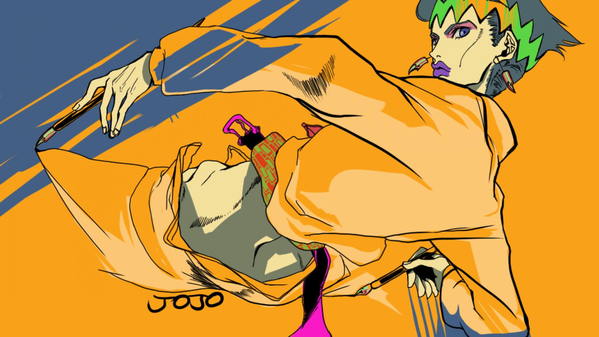 Description: A drawing of a man with a knife in his hand and a woman with a pink dress on her back.