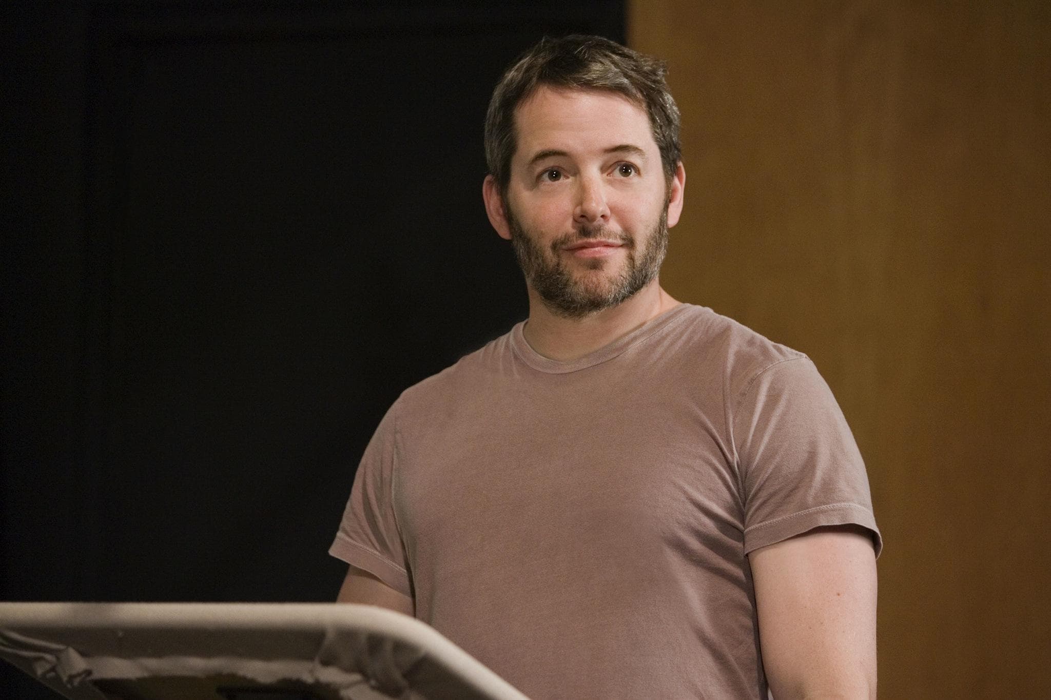 Description: A man standing in front of a laptop computer in a room with a wooden wall and a black background.