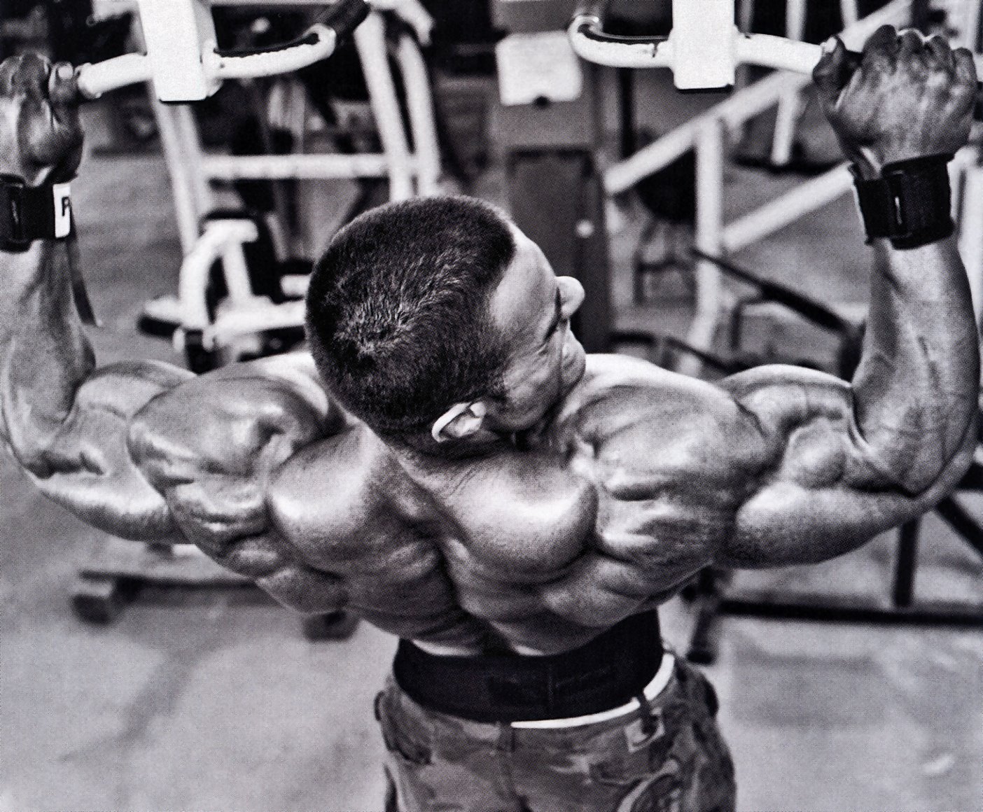 Description: A man with a large back and a big chest in a gym with a barbell rack in his hand.