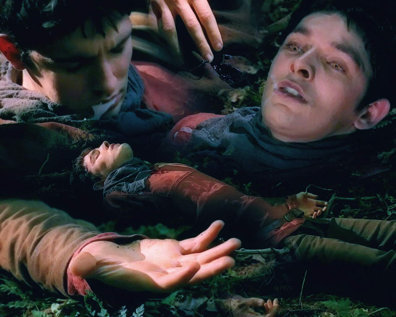 Description: A man laying on the ground next to another man holding a knife in his hand and a woman reaching out.