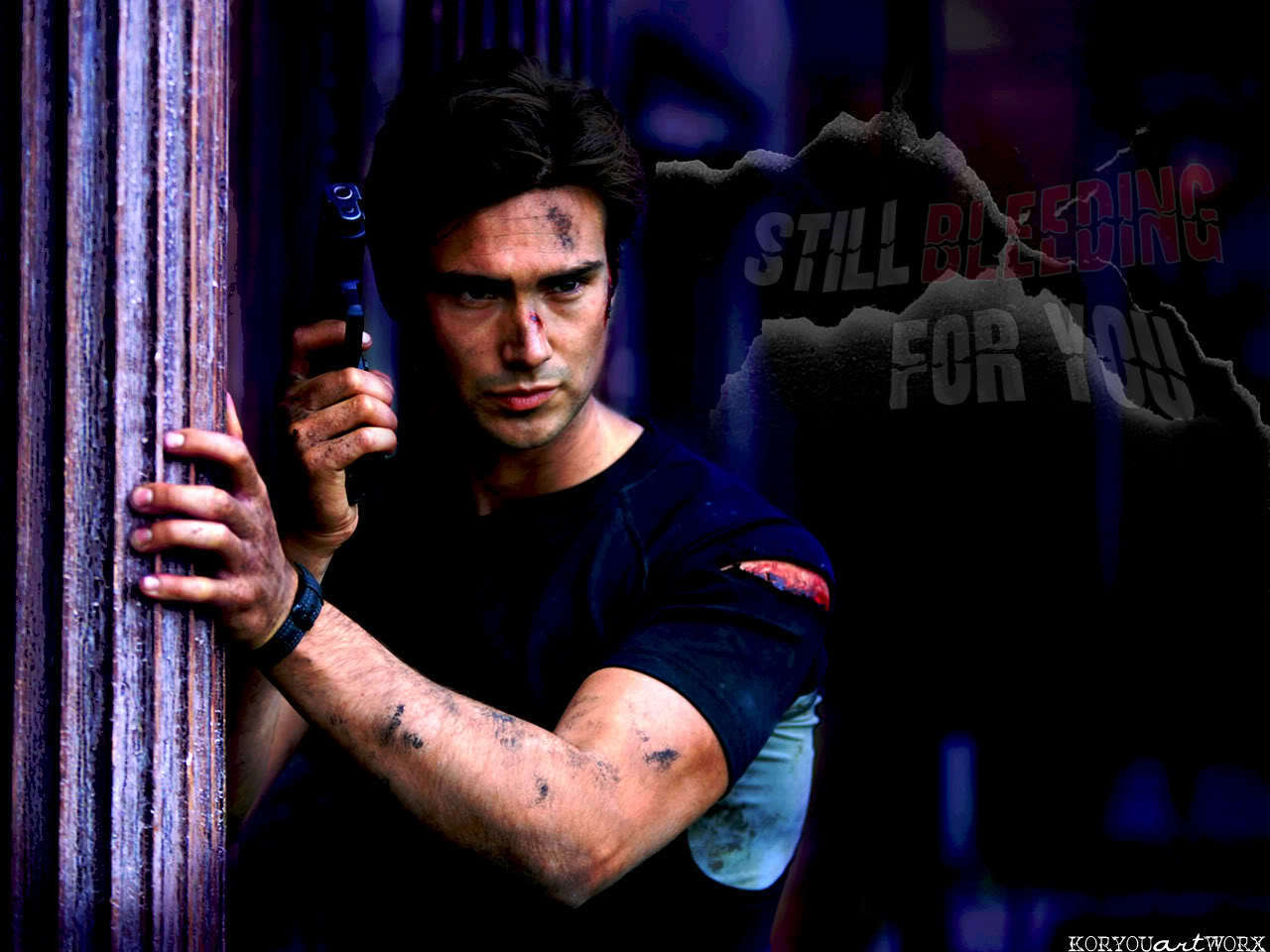 Description: A man holding a cell phone while leaning against a pole with his arm around a pole and looking at the camera.