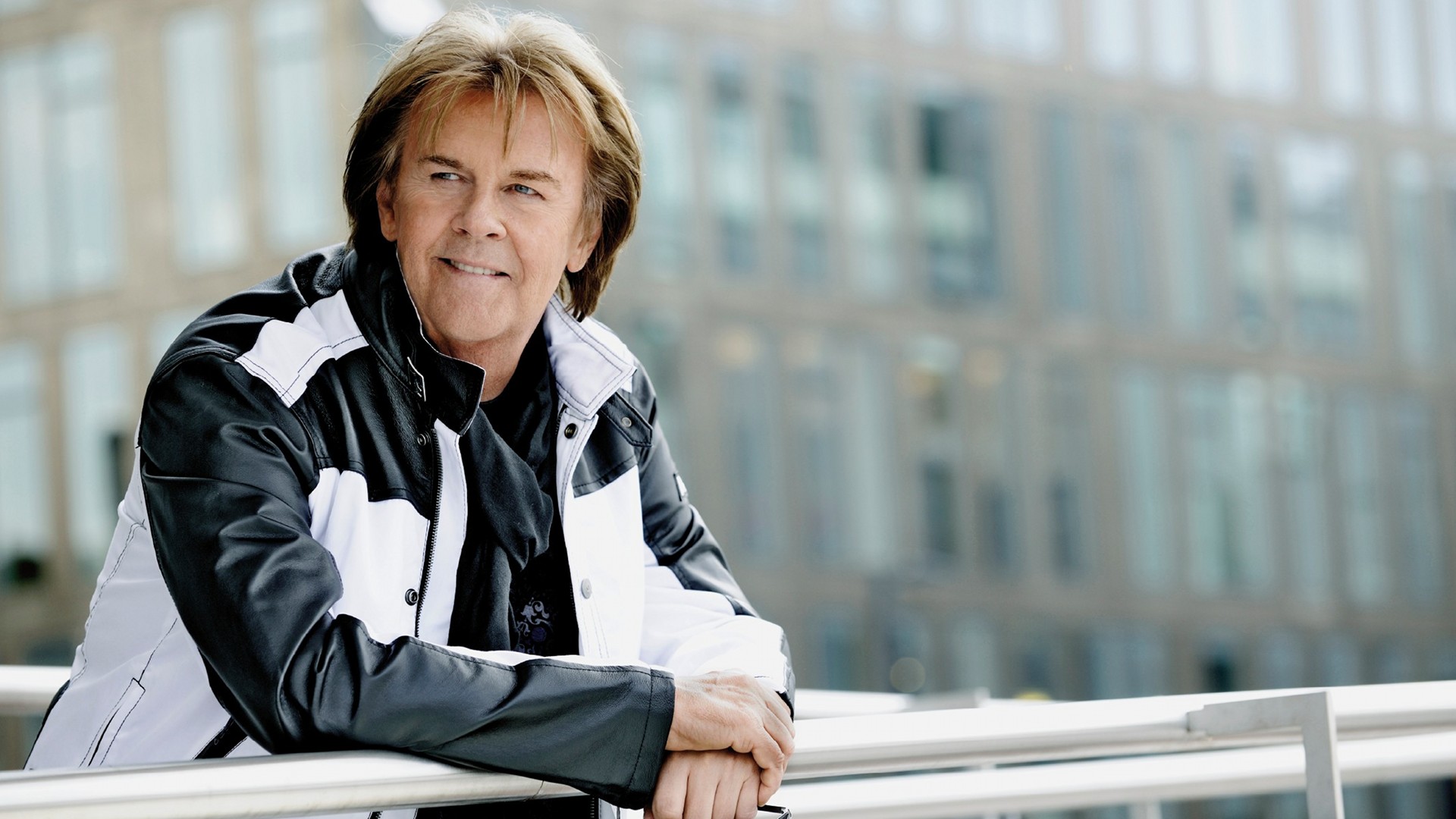 Description: A man leaning on a rail in front of a building with a building in the background and a building across the street.
