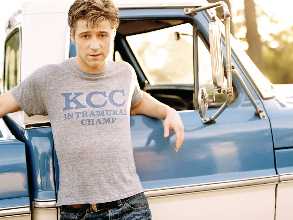 Description: A man leaning on the side of a truck with his hand on the door handle and his arm on the truck.