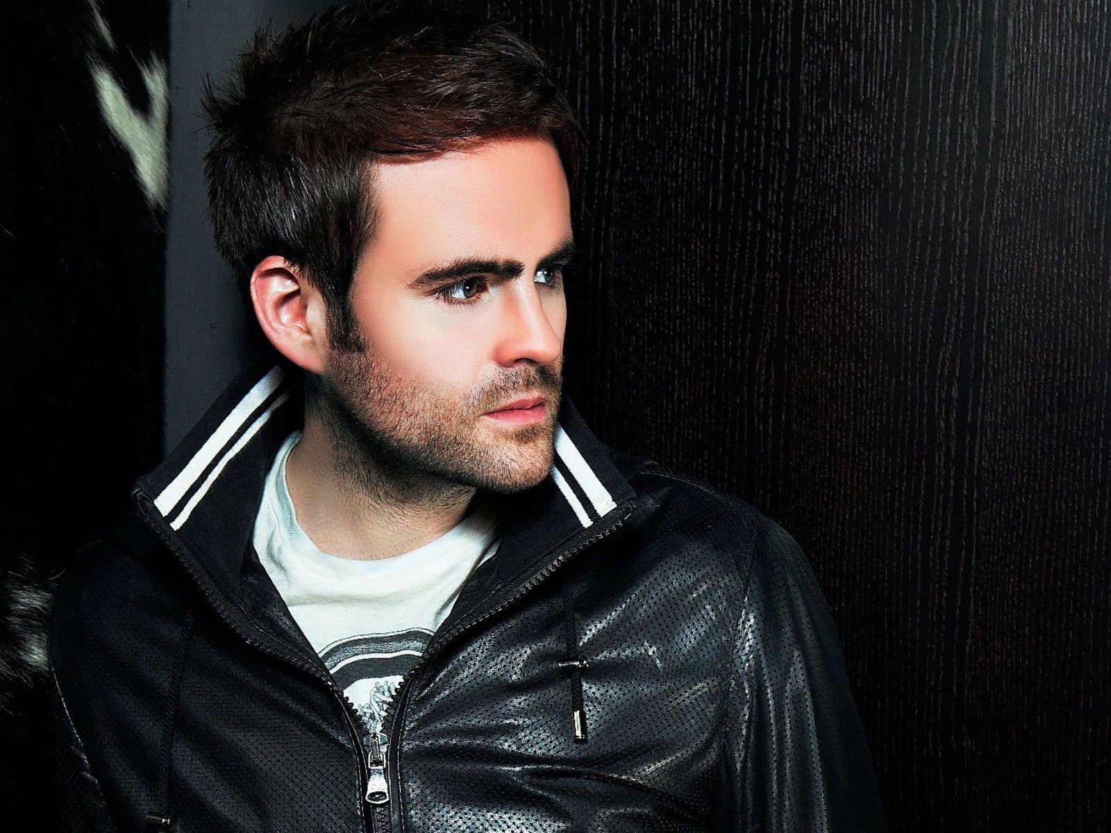 Description: A man in a leather jacket leaning against a wall with his head turned to the side and his eyes closed.