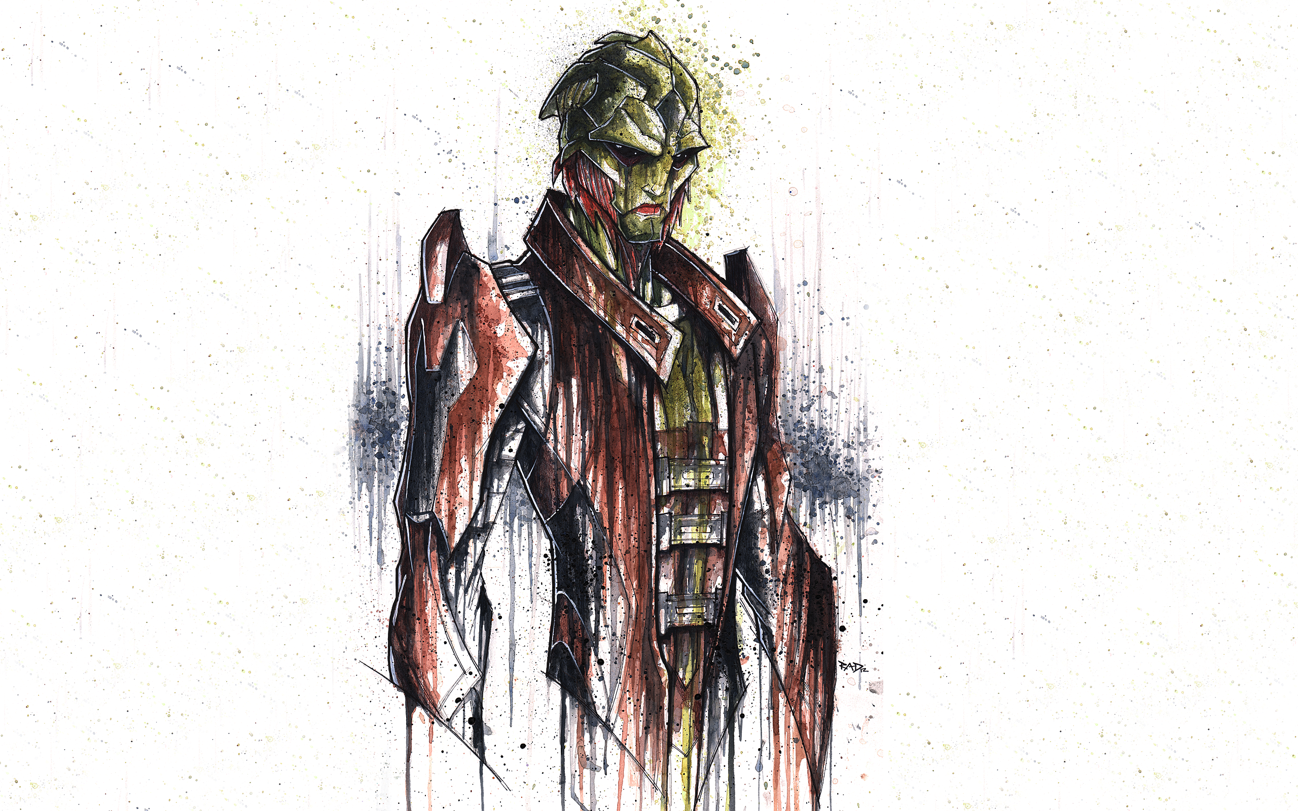 Description: A drawing of a man in a leather jacket and a tie with a paint splattered background and a white background.