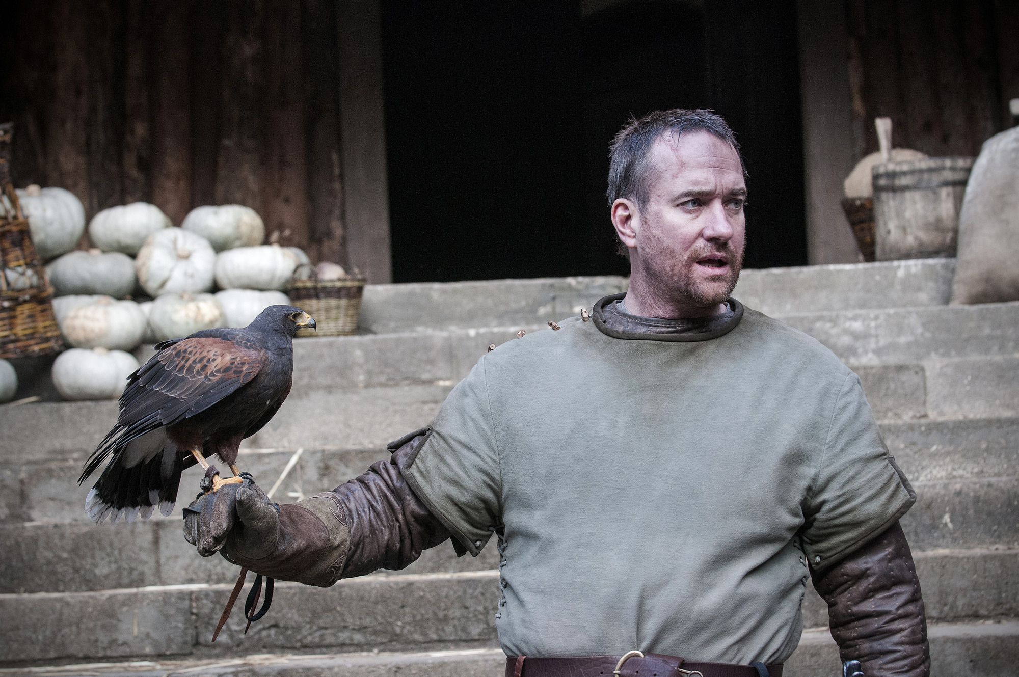 Description: A man in a leather outfit holding a bird on his arm and a knife in his hand with a lot of pumpkins in the background.