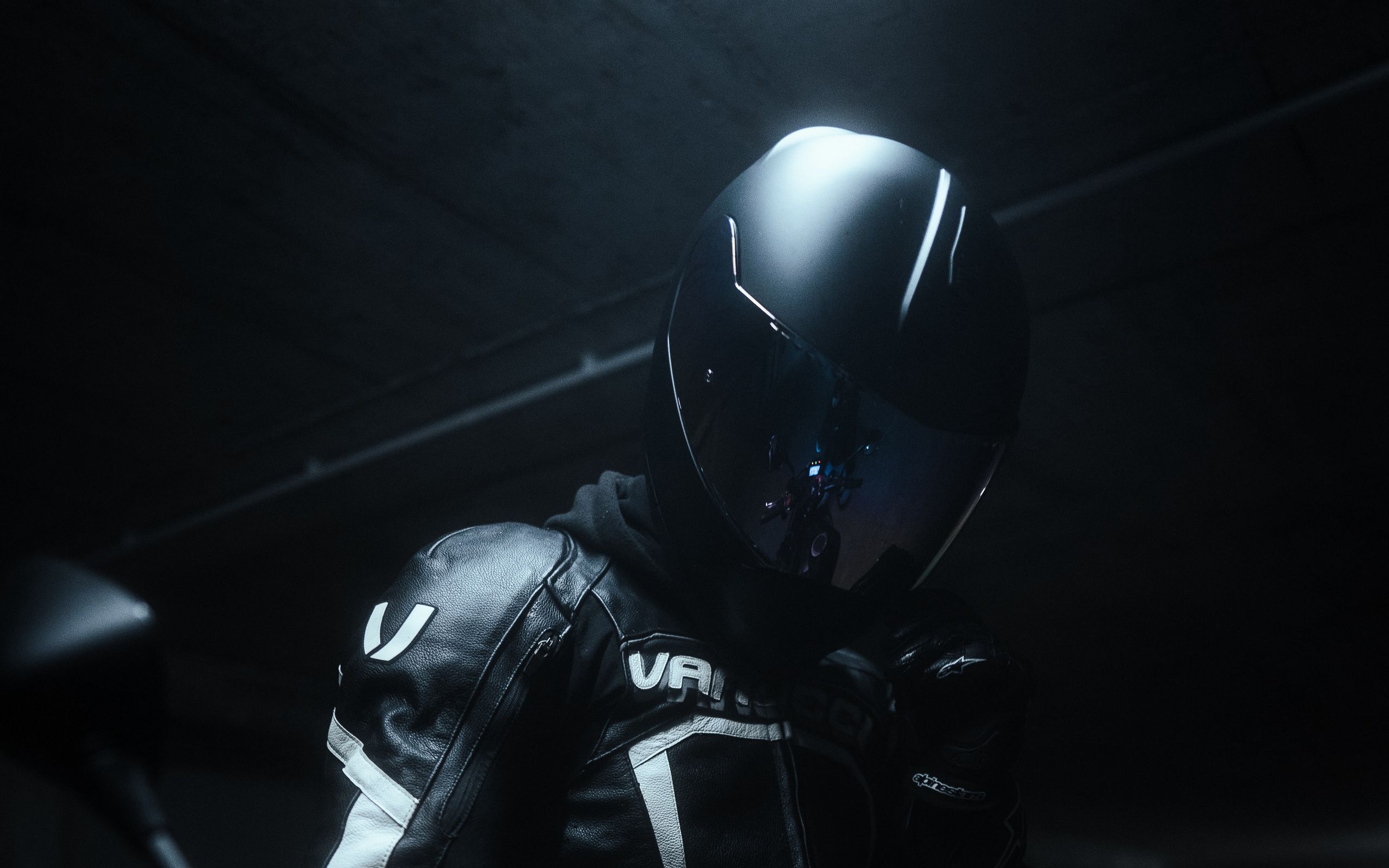 Description: A man in a black leather suit and helmet in a dark room with a spotlight on his face and a motorcycle helmet on.