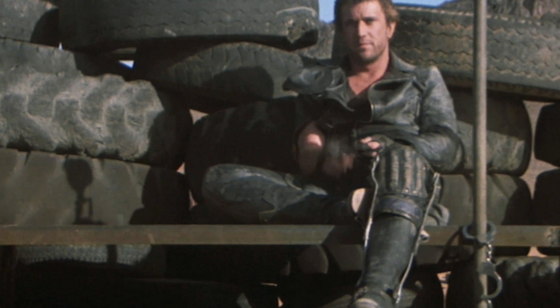 Description: A man in a leather outfit sitting on a truck bed with a gun in his hand and a helmet on his head.
