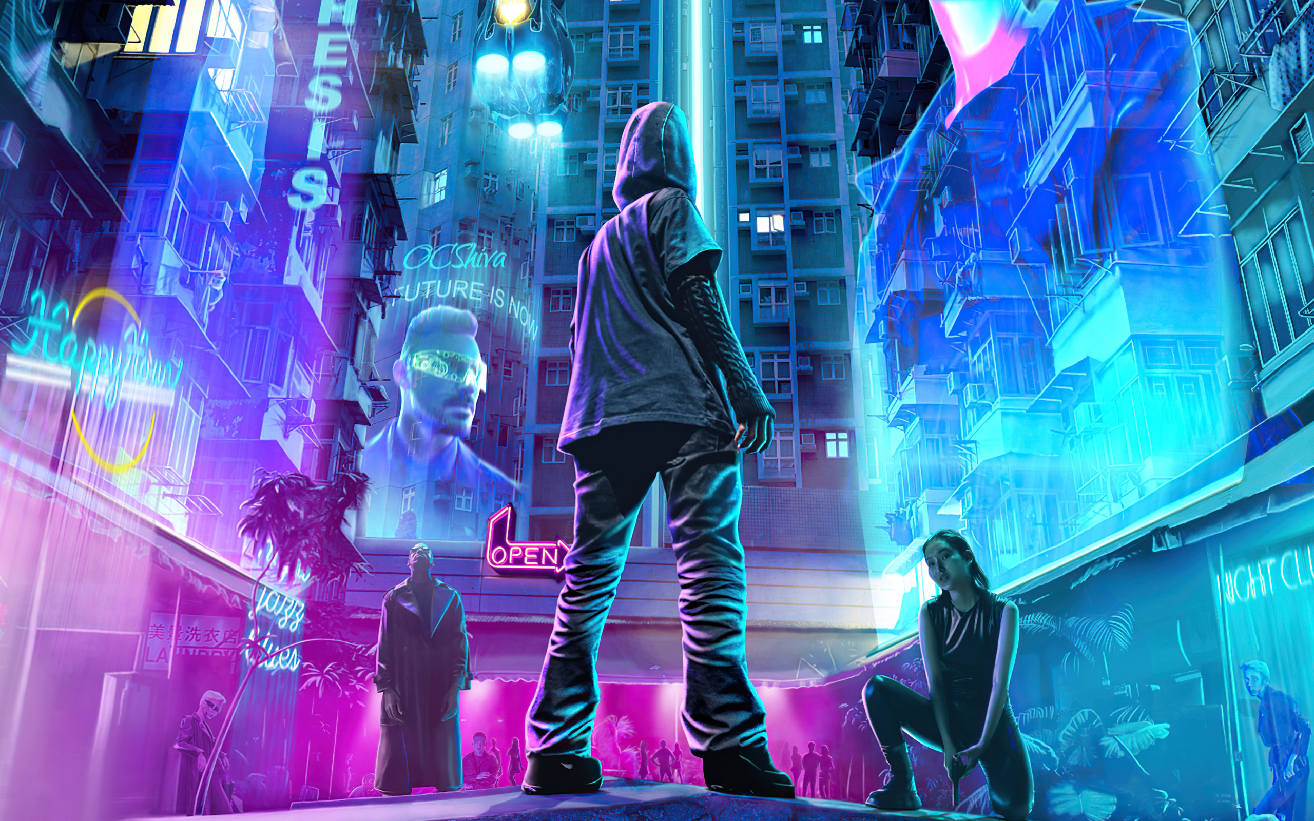 Description: A man standing on a ledge in a city at night with neon lights and a neon umbrella over his head.