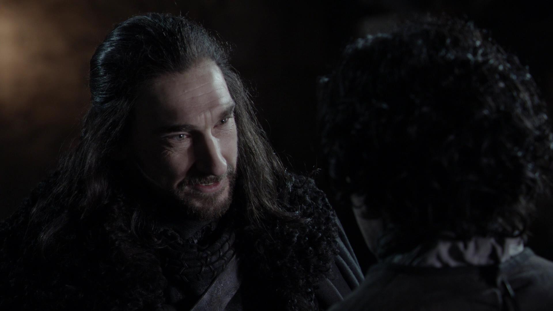 Description: A man with long hair and a beard in a dark room with a man in a fur coat looking at him.