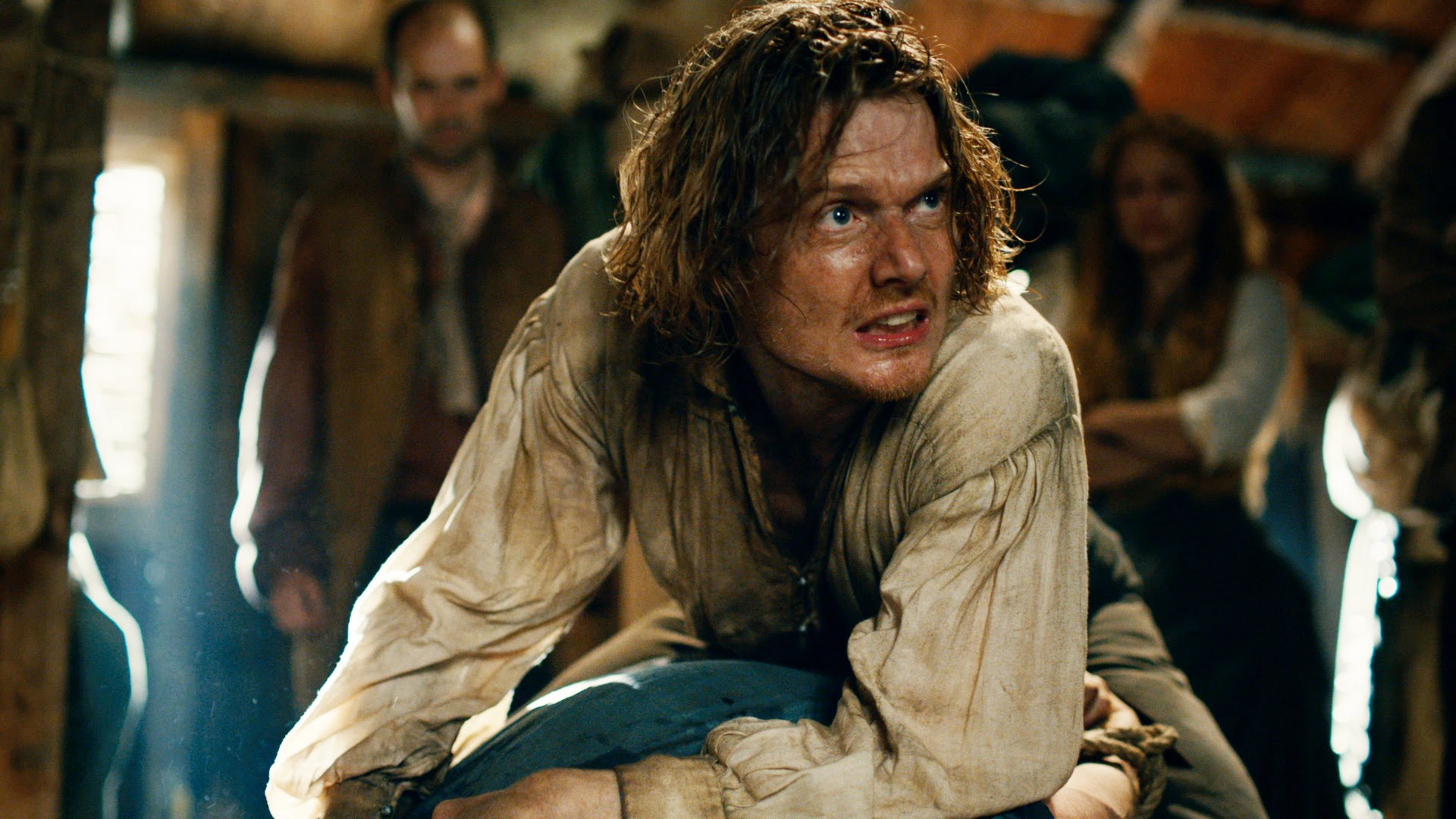 Description: A man with long hair and a beard is sitting on a chair in a room with other people around him.