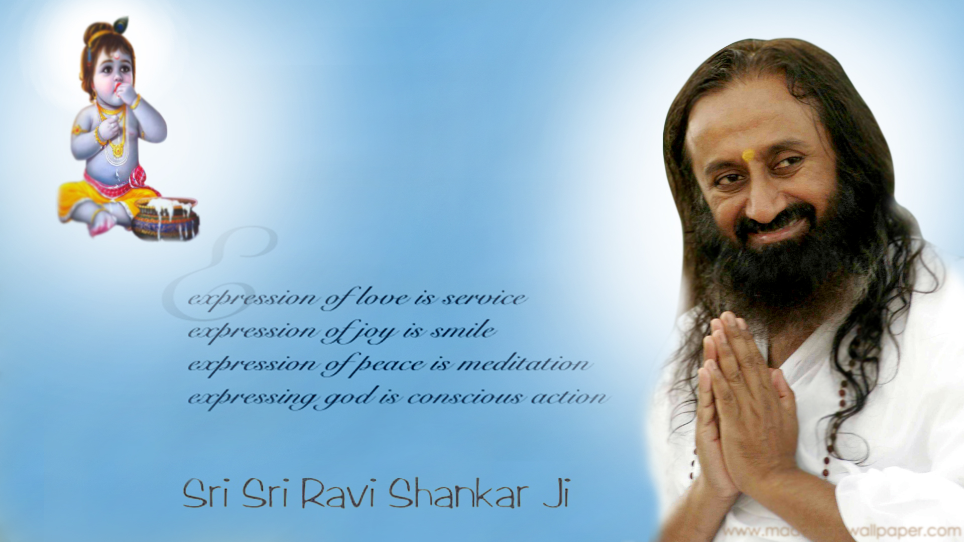 Description: A man with long hair and a beard is smiling and holding his hands together in front of him with a message written below.
