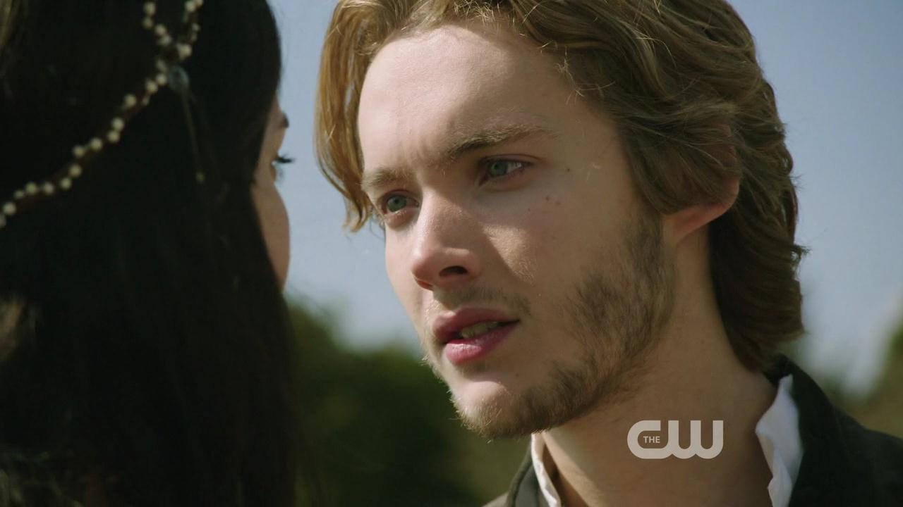 Description: A man with long hair and a beard is talking to a woman with long hair and a necklace on.