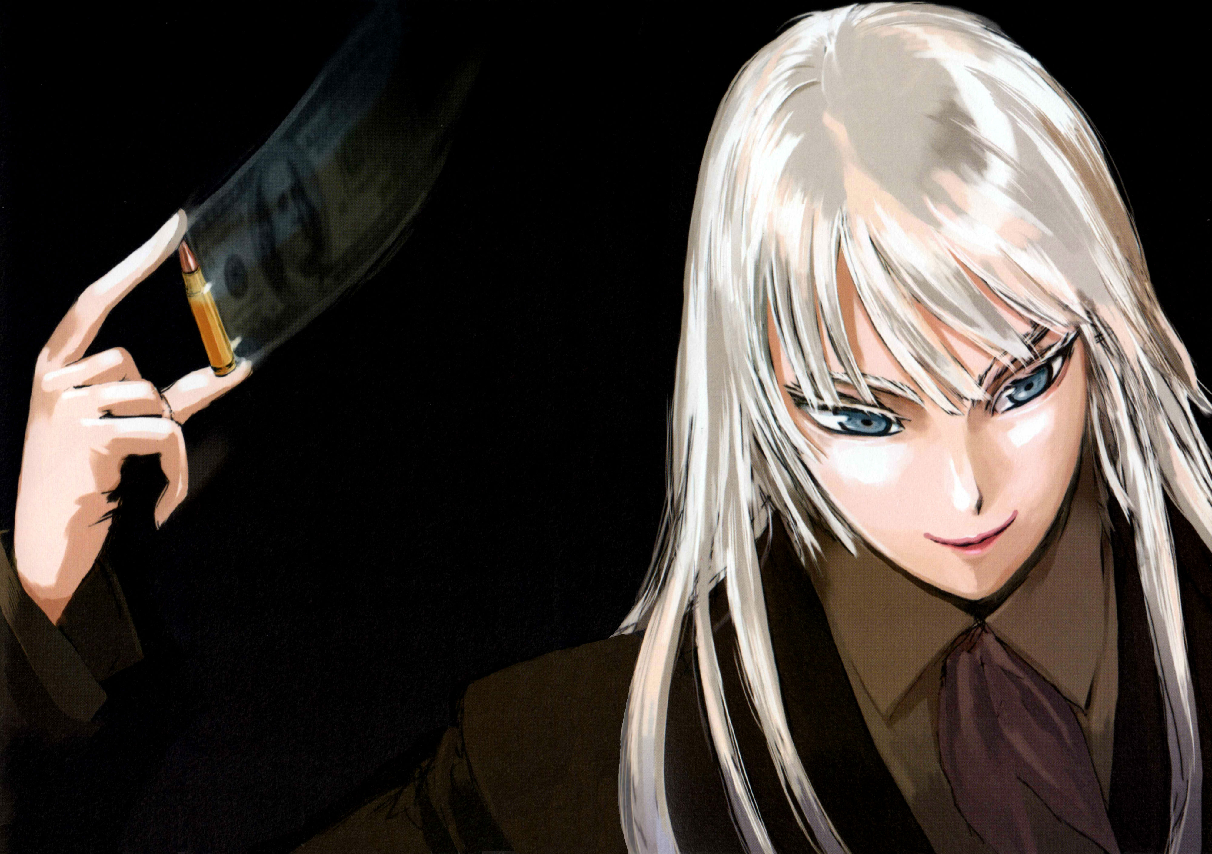 Description: A man with long white hair holding a knife in his hand and looking at the camera with a serious look on his face.