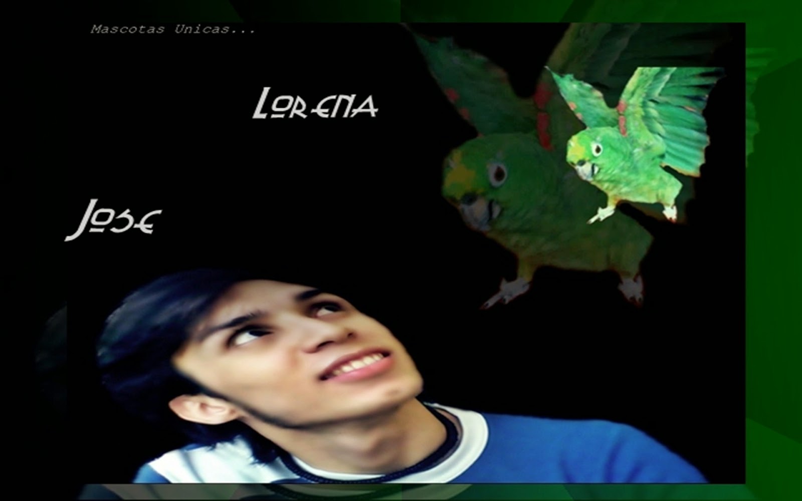 Description: A man looking up at a green bird flying over him and a green parrot sitting on his head and a green parrot on his shoulder.