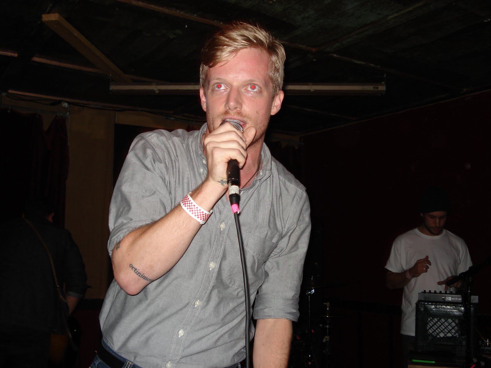 Description: A man standing in front of a microphone with a band on it's side and a band on the other side.
