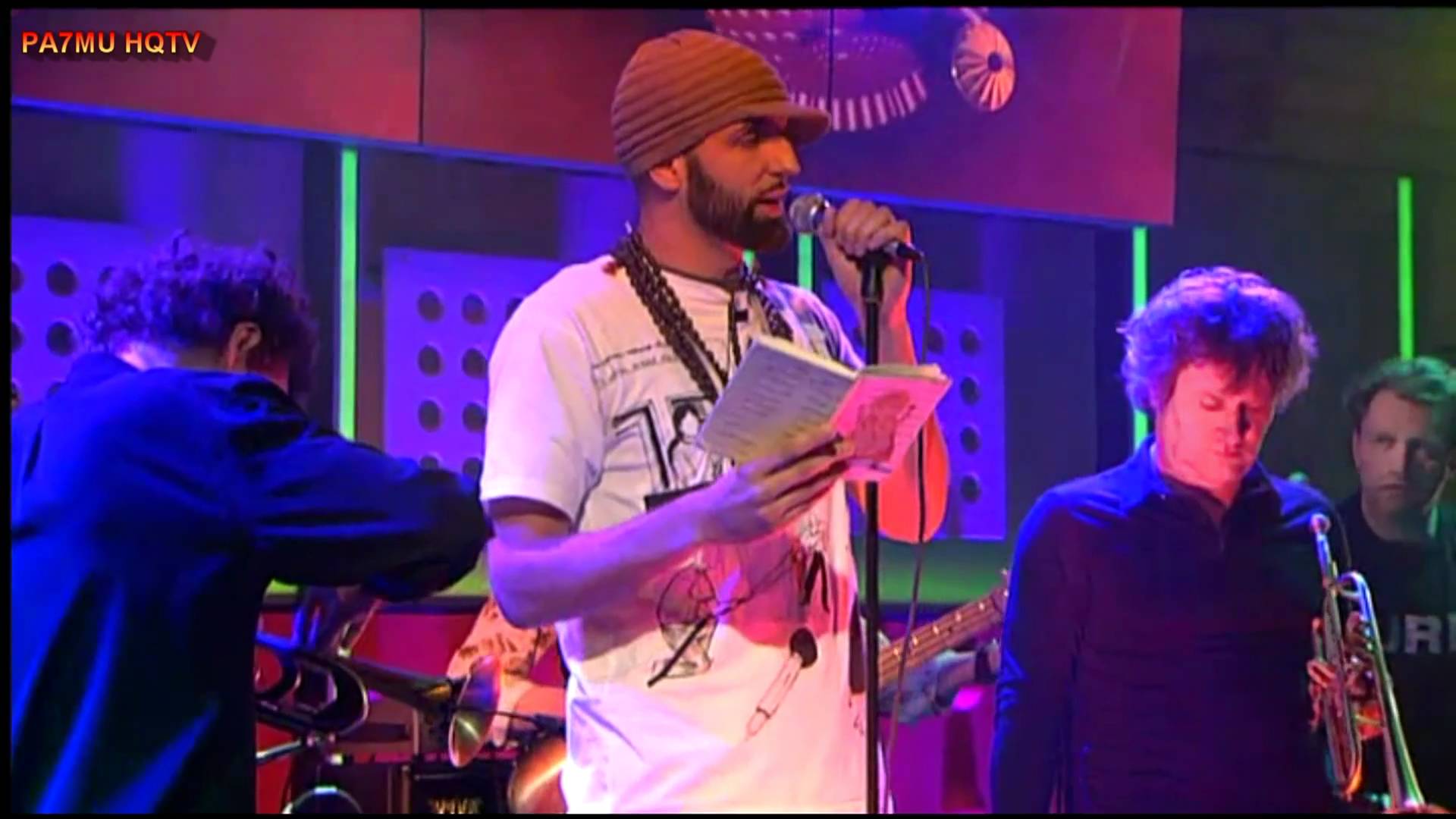 Description: A man standing in front of a microphone while holding a paper in his hand and a band member behind him.