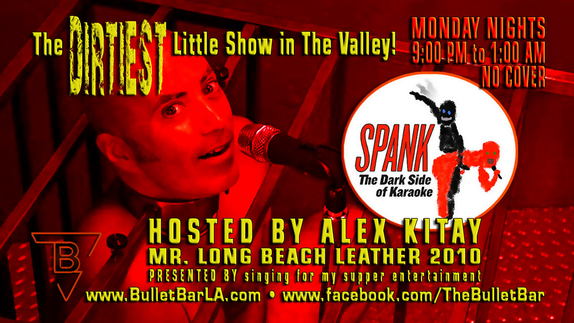 Description: A man with a microphone in front of a red background with a black and white photo of a man.
